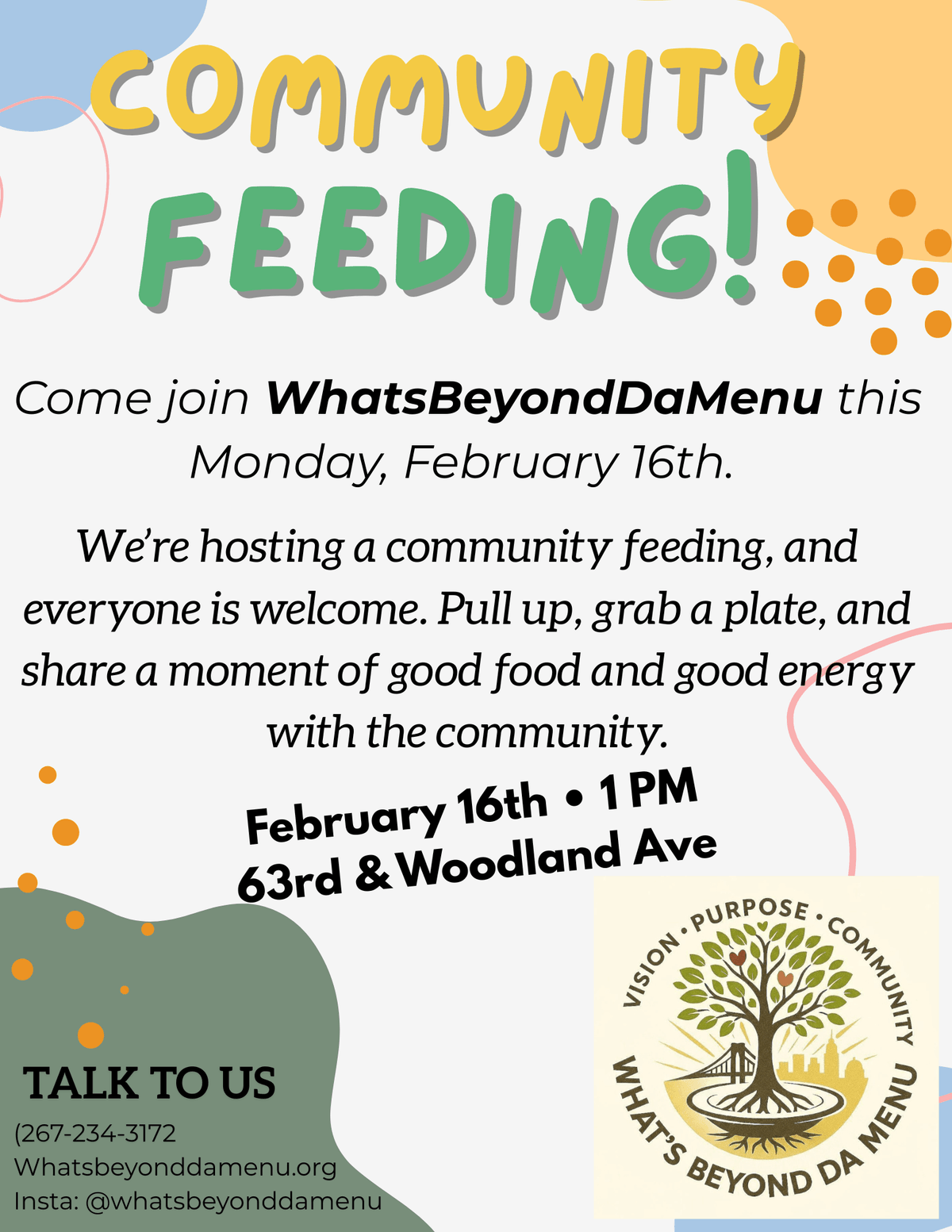 ٢٦ نوفمبر ٢٠٢٥Community Feeding InitiativeJoin Us for Our First Community Feeding! On Tuesday, November 26, What’s Beyond Da Menu will...٢٦ نوفمبر ٢٠٢٥Community Feeding InitiativeOur initiative to feed the homeless is a critical aspect of our commitment to ensuring no one...٤ نوفمبر ٢٠٢٥Let’s Grow Together We can only grow when we truly understand what’s happening in our...Community Feeding InitiativeOur monthly food drive is currently in the works, but it will become a key part of our mission....٢٩ سبتمبر ٢٠٢٥Community ImpactAt What’s Beyond Da Menu, we may be new, but our vision is bold: to create hope, opportunity, and...٢٩ سبتمبر ٢٠٢٥Community ImpactHunger to Hope: My Story There was a time when life felt heavier than I could carry. For five...