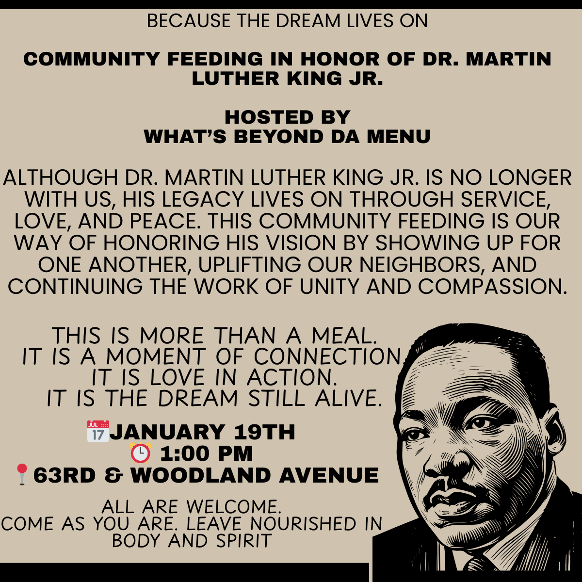 2025年11月26日Community Feeding InitiativeJoin Us for Our First Community Feeding! On Tuesday, November 26, What’s Beyond Da Menu will...2025年11月26日Community Feeding InitiativeOur initiative to feed the homeless is a critical aspect of our commitment to ensuring no one...2025年11月4日Let’s Grow Together We can only grow when we truly understand what’s happening in our...Community Feeding InitiativeOur monthly food drive is currently in the works, but it will become a key part of our mission....2025年9月29日Community ImpactAt What’s Beyond Da Menu, we may be new, but our vision is bold: to create hope, opportunity, and...2025年9月29日Community ImpactHunger to Hope: My Story There was a time when life felt heavier than I could carry. For five...